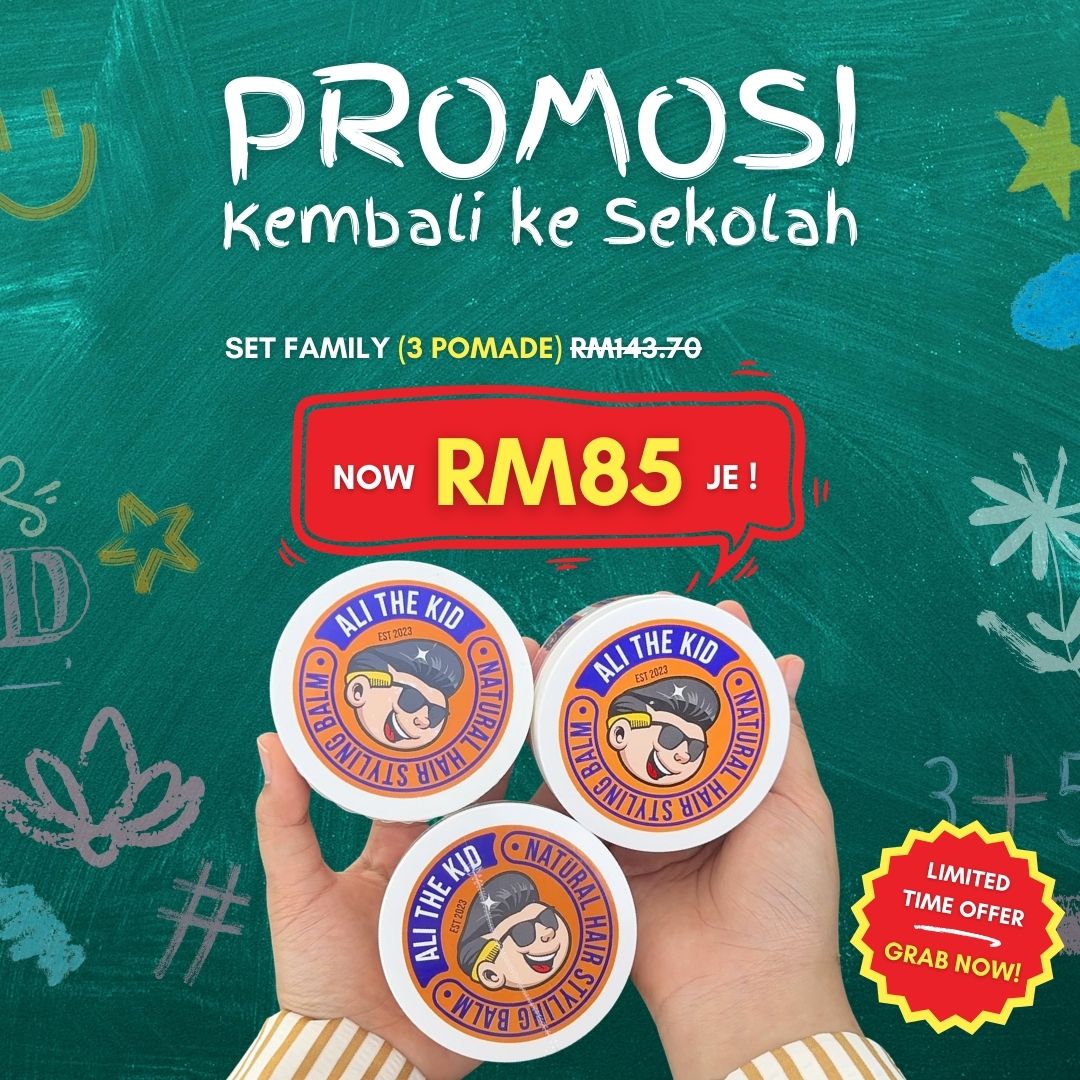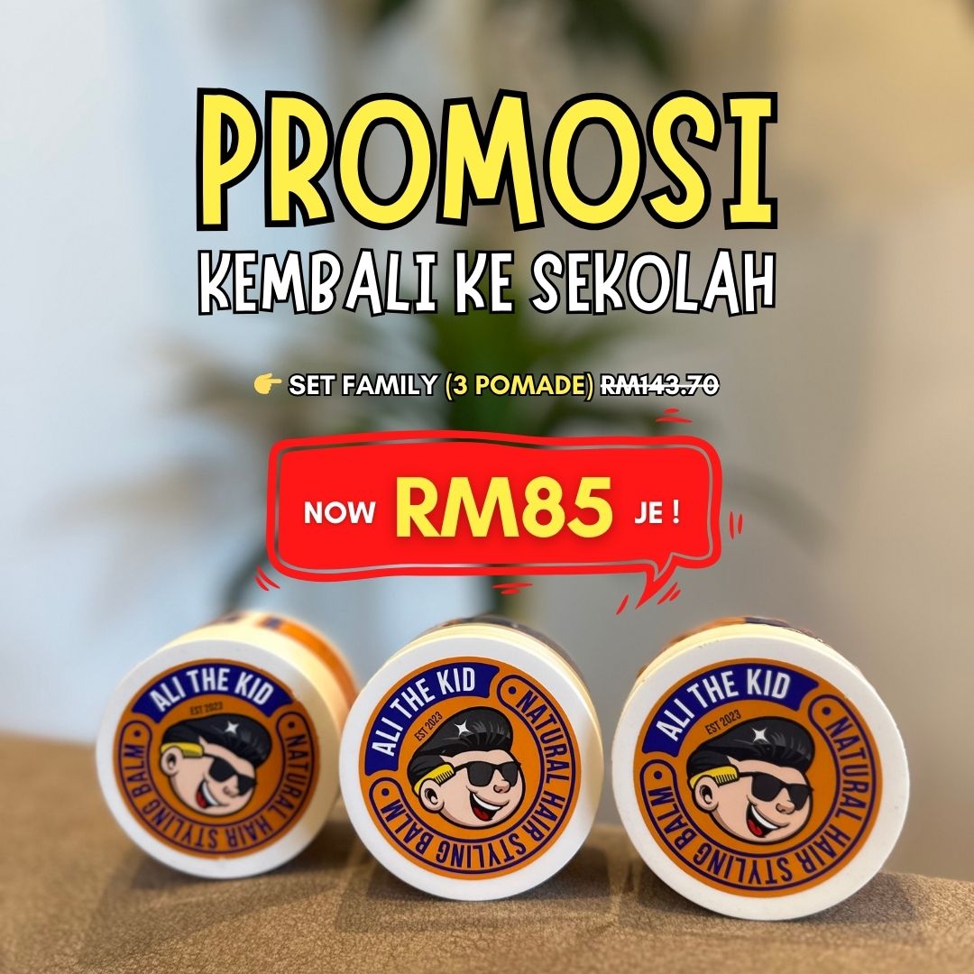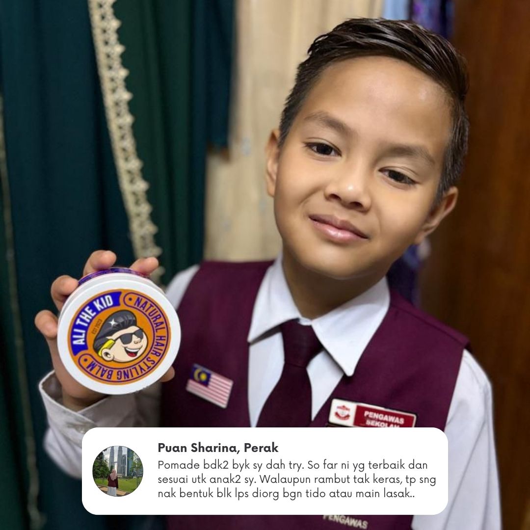 Anak dah nak mula sekolah, confirm mak-mak tengah ready kelengkapan — jangan lupa stanby pomade Ali The Kid supaya rambut anak kekal kemas & smart sepanjang hari!